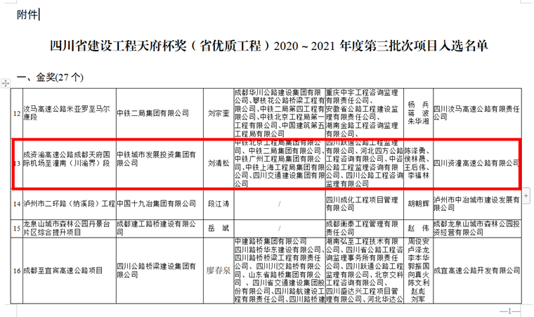 2022年6月8日、6月24日,由四川资潼高速公路有限公司负责开元棋牌的成资渝高速公路成都天府国际机场至潼南(川渝界)段项目,先后一举获得省开元棋牌系统用户满意工程和2020-2021年度省天府杯(优质工程)金奖两项荣誉。