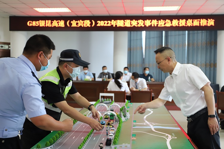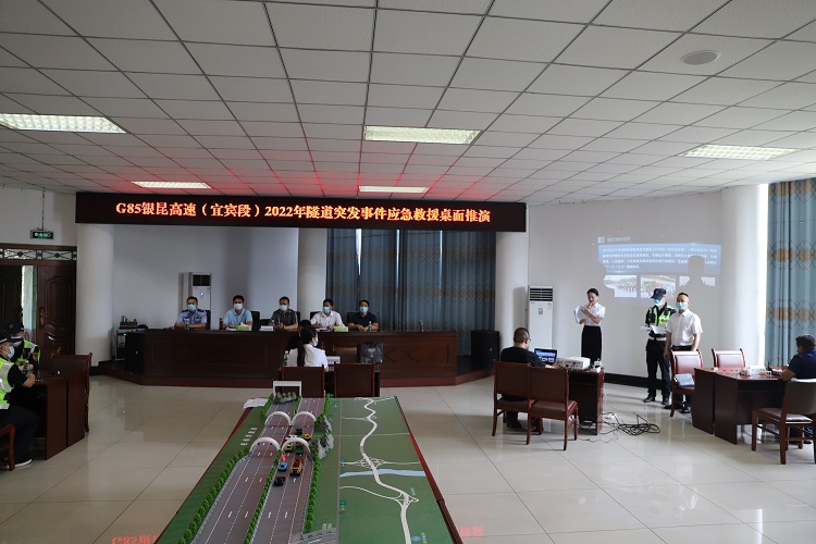 演练采取沙盘推演的形式,模拟了辖区内某隧道内发生多车追尾、货车货物起火释放大量浓烟及有人员伤亡等情况,宜宾管理处立即按照应急预案启动应急响应,通过与高速交警、交通执法、地方政府相关部门协同作战,较为圆满地完成了演练。