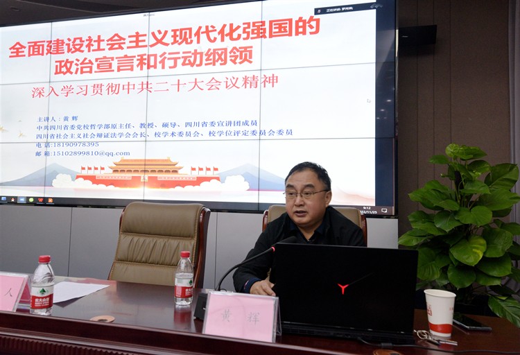 黄辉教授从党的二十大会议基本情况简介、党的二十大会议的主题和重大意义、党的二十大报告全文学习解读,二十大报告中的新观点、新论断、新思想等四个方面,对党的二十大精神进行了全面深入宣讲阐释。