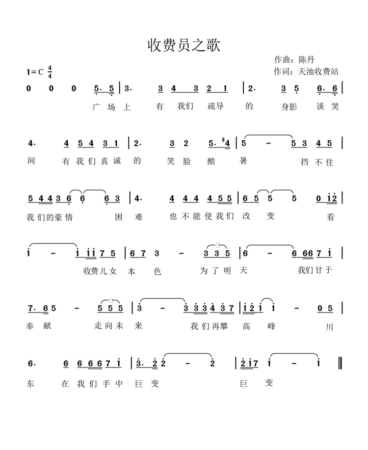 陈丹同志是华蓥山收费站收费员,在此次天池收费站打造过程中,牺牲业余休息时间,主动为天池收费站创作站歌《收费员之歌》,歌词内容积极,高度概括了一线收费员的工作、责任、使命,乐曲优美、坚定有力,唱出了广大一线收费员的心声,深受员工和群众的喜爱与好评,引起了强烈共鸣。