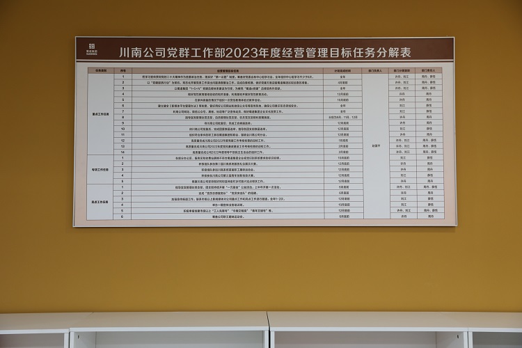 二是挂图作战,实现精准推进。为确保各项工作任务按计划推进,在签订目标责任书的基础上,各部门、各管理处还对具体工作任务进行了层层分解,制定了《2023年度经营管理目标任务分解表》,逐条落实工作任务,确保责任到人。同时将任务分解表张贴上墙、挂图作战,形成了部门负责人全面抓、部门分管负责人重点抓、相关责任人具体抓的良好工作局面。