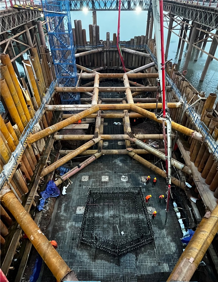 嘉陵江特大桥主桥结构形式采用双塔、双索面、密索、对称扇形布置、预应力砼双边箱主梁、塔墩固结塔梁支承的半漂浮结构体系,桥梁全长2327.48米,主桥长500米,标宽34米,横卧于嘉陵江江面,引桥依次跨越嘉陵大道、文峰街道、山麓大道。此次浇筑的3号主墩承台,采用群桩基础,桩基共18根,桩径2.5米,承台呈矩形状高5米,累计浇筑混凝土方量2862立方米,为大体积承台,采取整体一次性浇筑方式。由于受承台混凝土量大、浇筑耗时长、水下基础水位差18米、承台嵌岩深度大、岩层破碎等多种因素影响,施工难度大,公司联合项目部充分研究论证,制定了专项施工技术方案和应急保障措施,对人员、物资、机械设备等作了周密部署。在浇筑过程中,为保证大方量混凝土的生产质量,监理、试验室和现场技术人员严格控制混凝土浇筑厚度,使用冷却管做降温处理,强化温控,防止混凝土内部温度过高而导致开裂,同时做好数据记录与质量监控,确保整体浇筑质量。