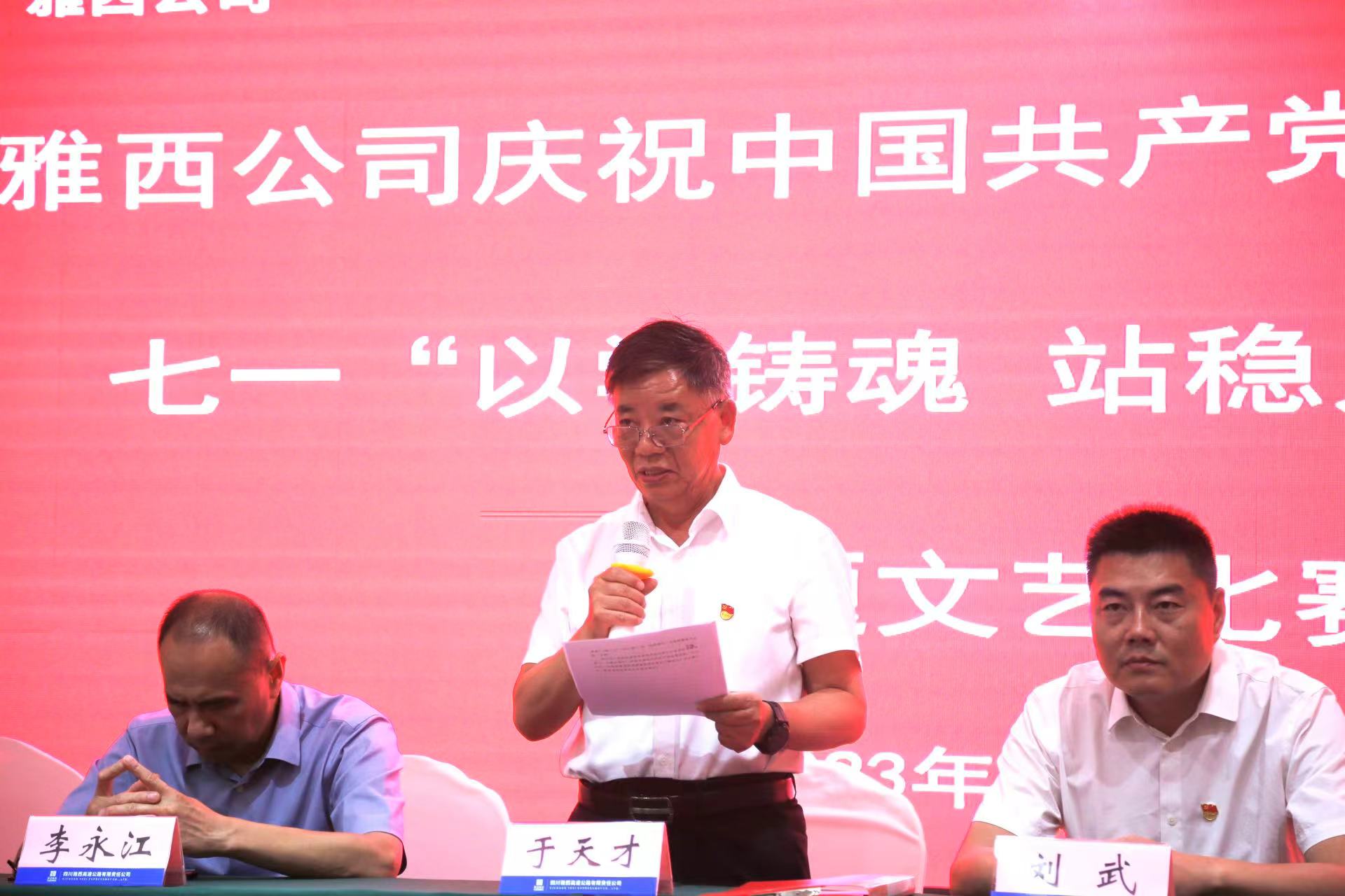 主题活动由公司党委委员、副总经理、工会主席刘春主持,在庄严的国歌声中拉开了序幕,公司党委副书记、总经理刘武带领全体与会党员重温入党誓词。各党支部表演展示了《坚守初心 守护安全:共产党员刘杰的故事》《我的雅西 我的情》《致敬平凡》等10组节目,充分展现了雅西人的风采和魅力。最后,公司党委书记、董事长于天才作了讲话。