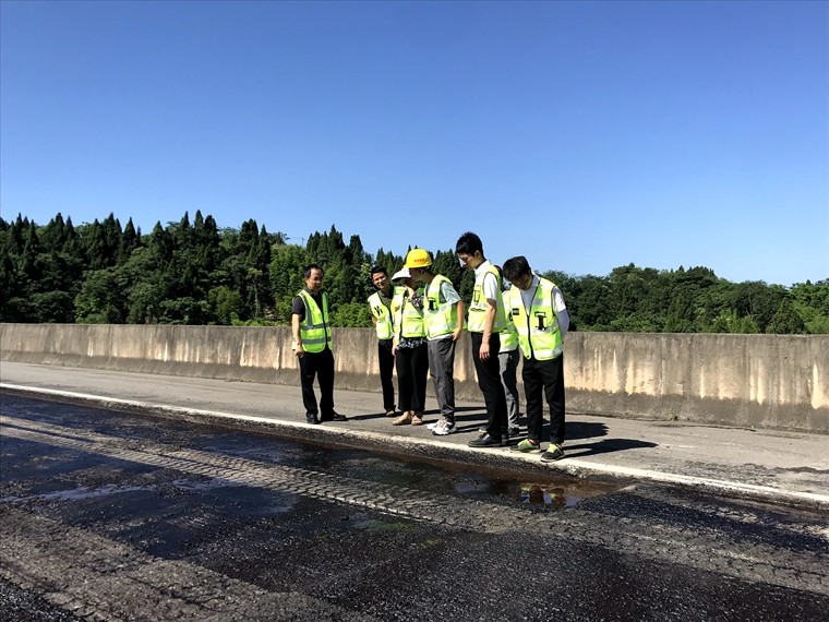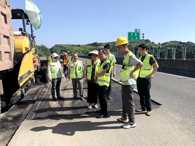 7月5日,川高公司养护部部长周栓科一行到渝蓉高速路面病害处治工程现场检查指导工作,川西公司及渝蓉公司相关部门负责人陪同。
