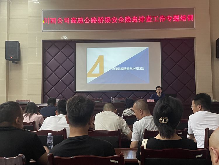 为贯彻落实厅高管局、蜀道集团及川高公司防汛减灾以及桥梁安全运行工作要求部署,确保管辖高速桥梁运行安全,进一步提高桥梁养护管理技术人员的管养能力,提升桥梁养护队伍的业务水平,7月12日,川西公司组织开展了高速公路桥梁安全隐患排查工作专题培训,公司养护部、路安部、绕东管理处、绕西管理处、资潼公司、渝蓉公司以及各施工单位相关人员参加了此次培训。