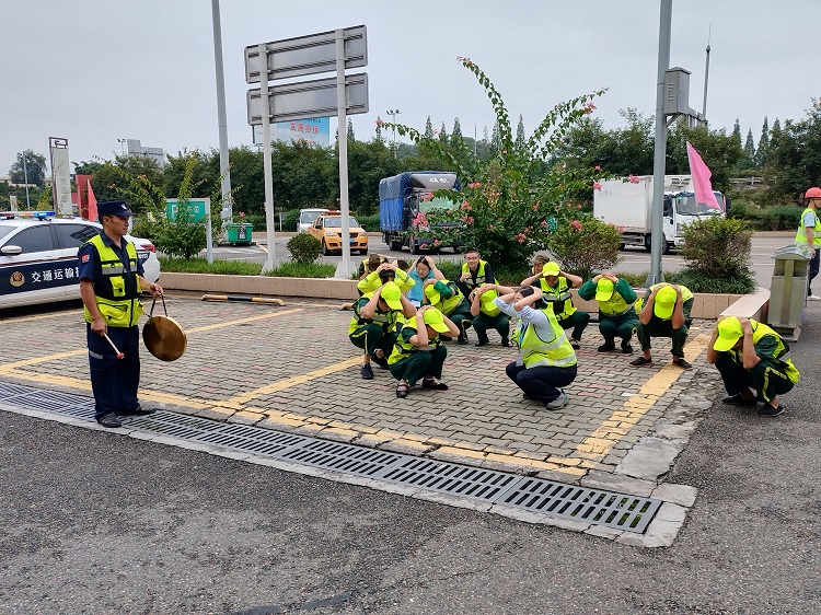此次演练模拟泸县发生5.0级地震,服务区现场管理人员立即组织办公楼、餐厅、超市等地人员撤离到地震避灾点。服务区现场管理员巡查发现,服务区B区出口一辆小车被落下的石头砸坏且无法移动,情况紧急。服务区现场管理员立即通知监控中心,并向管理处值班领导报告。同时监控中心通知辖区高速交警、交通执法、管护大队前往灾害现场进行交通管制和灾情处置。