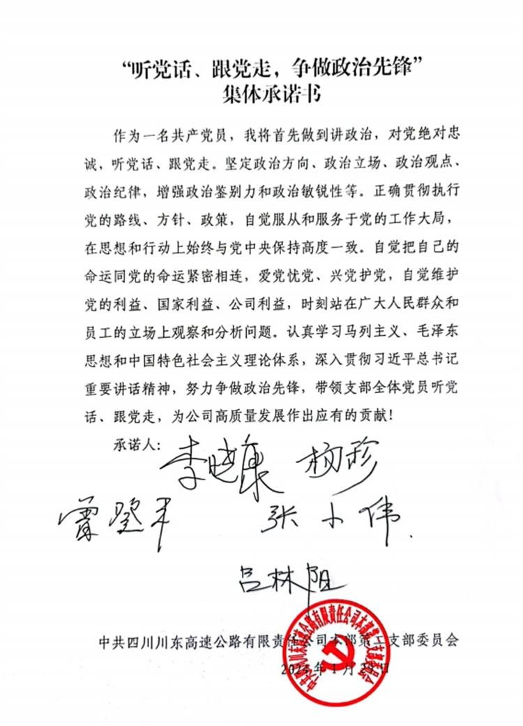 会议共两个议程,一是集中学习习近平在二十届中央纪委三次全会上发表的重要讲话、近期习近平关于安全生产的指示精神等;二是签订“听党话、跟党走,争做政治先锋”集体承诺书,围绕主题党日活动,全体支委委员逐一做了表态发言,纷纷表示将加强政治理论学习,对党绝对忠诚,听党话、跟党走,坚定政治方向、政治立场、政治观点、政治纪律,增强政治鉴别力和政治敏锐性,自觉服从和服务于党的工作大局,在思想和行动上始终与党中央保持高度一致,深入贯彻习近平总书记重要讲话精神,努力争做政治先锋,带领支部全体党员听党话、跟党走,为公司高质量发展作出应有的贡献。