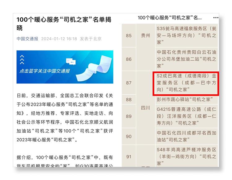 成德南公司金堂服务区“司机之家”获评全国2023年暖心服务“司机之家”