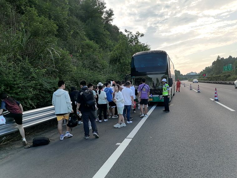 在了解情况后,路巡人员立即靠边停放巡逻车,开启警示灯,并在大客车后方摆放安全锥桶,设置安全防护区,警示后方来车注意减速慢行,防止发生二次事故。同时一边安抚乘客情绪,一边将其护送至护栏外安全区域,确保广大交通参与者和滞留人员的人身安全。期间,路巡人员迅速将现场情况上报至数据监控中心,联系施救单位前往现场进行故障车辆维修。19时许,大巴车修理完毕,路巡人员引导乘客有序排队上车,并仔细清点人数,确保51名学生全部安全坐上大巴车。经核查人数全部到齐后,大巴车继续出发前往目的地,高速公路恢复畅通。