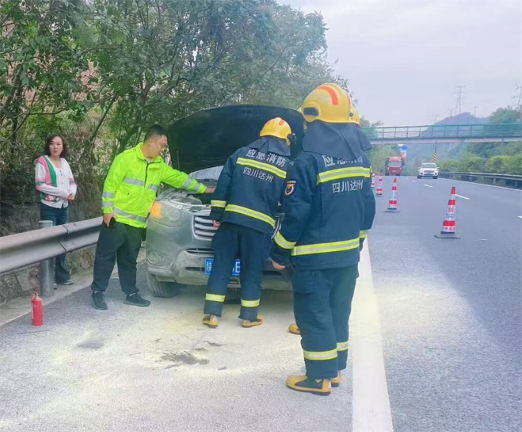 当日,达州管理处路巡人员在执行日常巡逻任务时,于K1360+620m路段(达州至百节方向)发现一辆越野车突发自燃,底盘部位冒出滚滚浓烟,而车上人员则焦急地站在护栏外侧,手足无措。面对这一突发情况,工作人员迅速响应,立即展开现场交通管控与人员调配。一是紧急联系119消防部门及清障车辆迅速抵达现场进行专业救援;二是迅速拿起灭火器,精准喷射冒烟部位,以遏制火势蔓延;三是及时对现场交通进行疏导,确保高速公路其他车辆的安全通行。