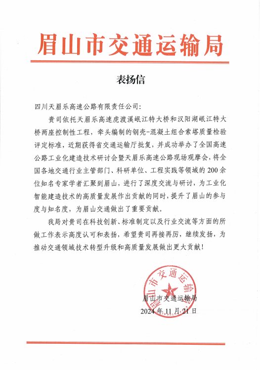 11月21日,天眉乐公司再传喜讯,再次收到一封来自眉山市交通运输局的表扬信,对天眉乐公司在科技创新、标准制定以及行业交流等方面所做的工作表示高度认可。