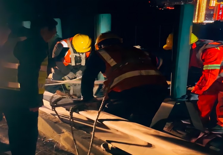 在抢险作业中,管理处安排相关技术人员对现场进行勘查,精准评估受损情况,并制定科学合理抢险方案。技术人员凭借专业技能,克服了桥下空间落差较高,中分带作业面狭窄,跨省作业区布设等困难,对受损盖板进行了应急拆除。安全保障人员全力维护桥上桥下现场秩序,确保抢险工作安全顺利开展。各抢险小组分工明确,紧密合作,经过5小时持续奋战,将破损盖板全部拆除,危机得以安全化解,有力保障了过往车辆与行人的出行安全。