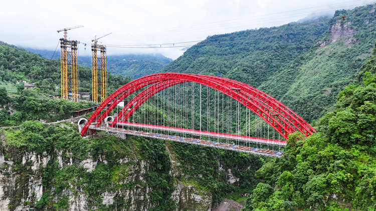 大河沟特大桥位于宜宾市屏山县,为全长293.4米的钢管混凝土中承式拱桥,桥面梁采用I字型钢格子梁,由两道主纵梁、三道次纵梁、吊杆和肋间横撑组成,是沿江高速XJ3标关键节点工程。本次左幅桥吊装完成30个节段,总用钢量约1600吨,标准节段梁长9.5米,宽16.85米,梁段边跨采用支架法,中跨采用缆索吊装方式,同步安装施工,确保拱肋吊装过程中受力均匀。