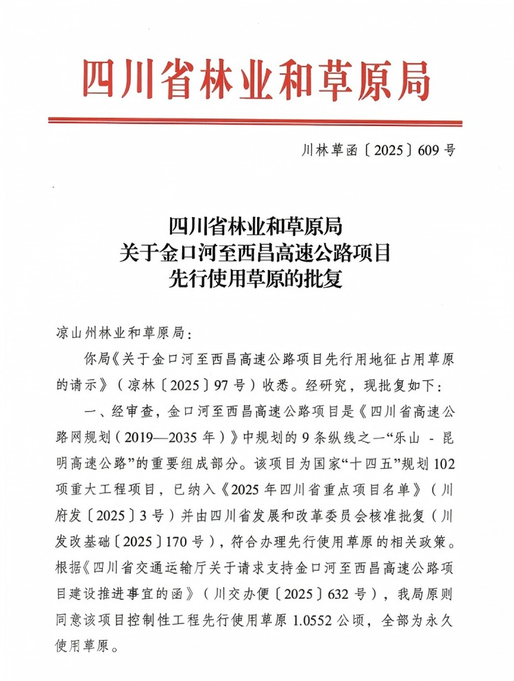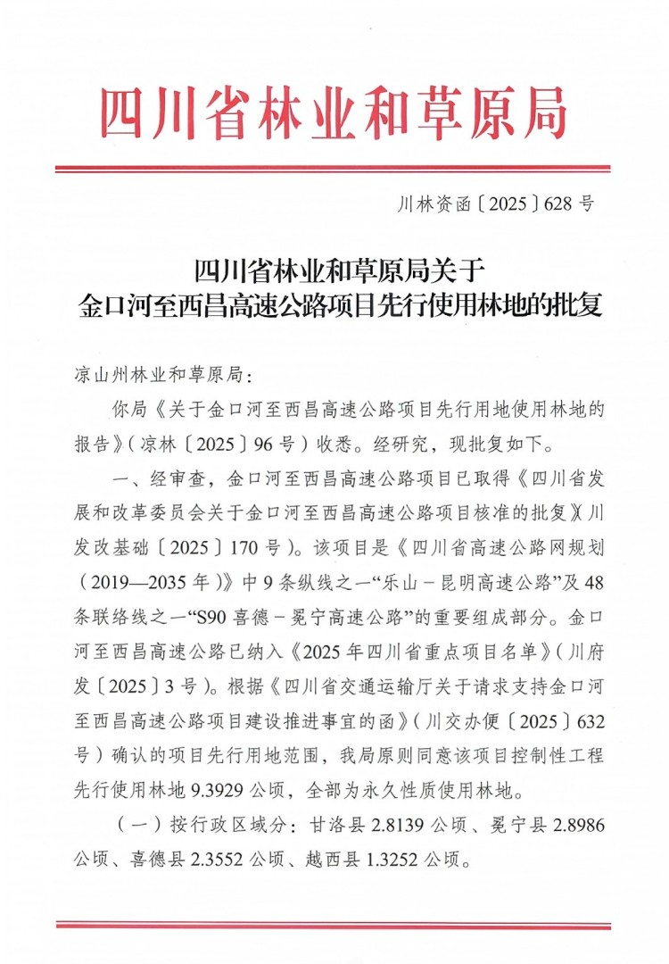 8月7日,金西高速公路项目再迎关键进展——先行使用林地申请正式获批。此前在7月31日,该项目先行使用草地已顺利通过批复。先行林草用地的相继落地,为项目控制性工程的合规启动筑牢了重要基础。