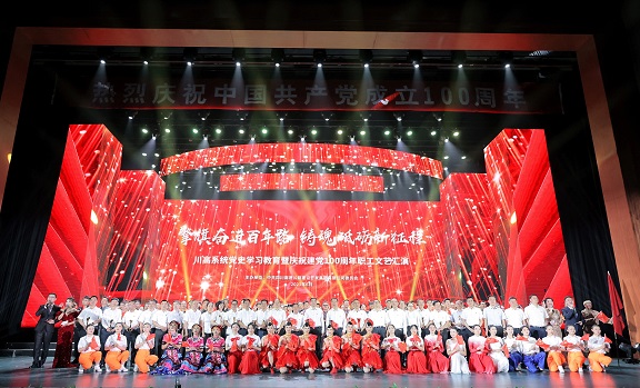 为热烈庆祝中国共产党成立100周年,深情回顾党的光辉奋斗历程,全面展示川高公司改革发展丰硕成果,进一步推动党史学习教育在川高系统走深走实。6月30日,川高系统“擎旗奋进百年路,铸魂砥砺新征程”党史学习教育暨庆祝建党100周年职工文艺汇演在成都成功举行。蜀道集团党委副书记邹蔚,原铁投集团总经理助理、党委组织部部长李琳,原交投集团总经理助理、党委组织部部长但勇出席观看演出。川高公司党委书记、董事长何刚出席并致辞。川高公司领导班子成员、监事会工作委员会委员、各部(室)负责人,系统各单位领导班子成员及部分职工代表共800余人参加。