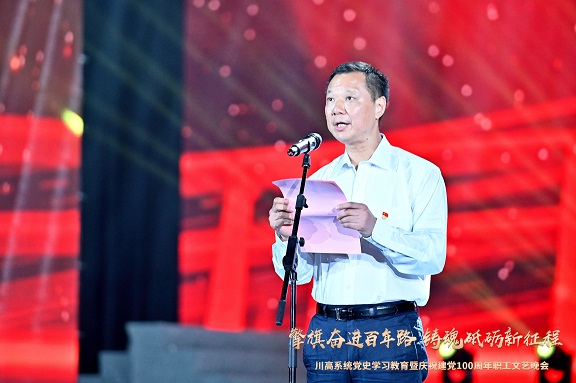 何刚董事长向出席活动的领导表示欢迎,向前期辛苦付出的全体参演人员表示感谢,向奋战在各条战线的全体干部职工表达了诚挚的问候和敬意。他指出,100年来,伟大的中国共产党一路战风斗雨、披荆斩棘,团结和带领全国人民实现了从站起来、富起来到强起来的伟大飞跃,开创了中华民族亘古未有的宏图伟业,书写了震天撼地的壮丽史诗。新时代呼唤新作为,新征程展现新担当。站在“两个一百年”的历史交汇点上,川高公司2477名党员和全体员工将用党的奋斗历程和伟大成就鼓舞斗志、明确方向,用党的光荣传统和优良作风坚定信念、凝聚力量,用党的实践创造和历史经验启迪智慧、砥砺品格,谱写川高公司高质量发展新篇章,为蜀道集团开好局、起好步贡献更多川高力量,以优异成绩向建党100周年献礼!