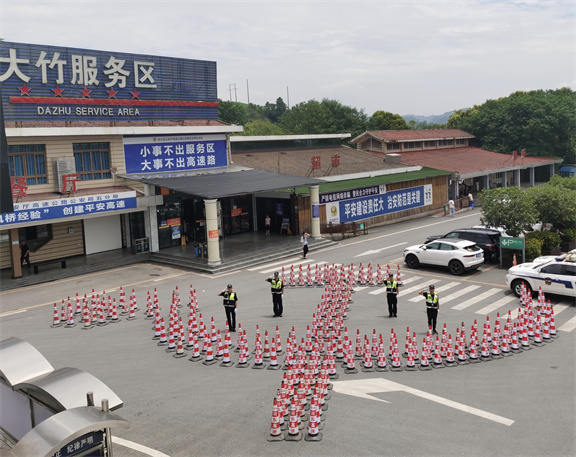 立足岗位服好务,精心备礼献给党。在大竹服务区,大竹路巡中队16名队员用时2小时,在服务区广场以天地为画布,以锥形桶为画笔,用300个锥形桶摆放成铁锤镰刀形状,向中国共产党成立100周年献礼。大竹服务区将乘势而为,上下齐心,甘于坚守平凡,用心服务社会,擦亮“全国优秀服务区”名片。