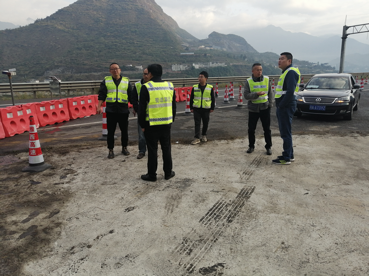 由于近期雅西公司养护人员在日常巡查中发现石棉隧道右洞(K2058+440)处二衬混凝土存在裂缝,随即对其隐患严密跟踪、持续监测。11月4日雅西公司启动应急处置预案,公司主要领导、分管领导带领养护、路安等相关部门人员第一时间赶赴现场查勘隧道病害情况,并组织公路设计院专家在石棉管理处召开专题会议,详细讨论抢险方案,要求尽快完成应急抢险处治。同时协调高速交警现场讨论现场交通管制方案付诸实施,确保隧道裂缝病害处治在确保安全情况下进行。