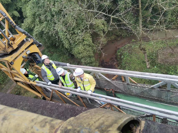 负责此次检测的四川金通工程试验有限公司现场负责人详细介绍了检测人员、机械、设备、技术及相关检测流程,随后开展了定检工作,根据现场检测的实际情况,对下一步工作提出意见:一是要落实专人跟踪整个桥梁检测,做好相关记录,并严格按照《公路桥涵养护规范》JTG5120-2021和川高检测实施指南进行督导。二是定期检测的情况记录、评分及对养护维修管理措施的建议,均应及时整理,并纳入桥梁管理系统数据库,按影响结构安全状况进行评估。三是加强疫情防控、严格落实行业防控规范。四是要严格按照交通组织方案实施工作,配备完善相关安全物资,严格按公路养护安全作业规程设置。