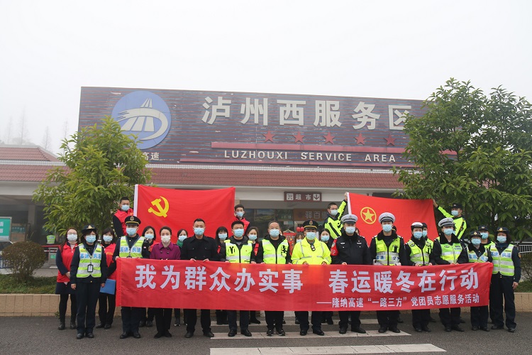 1月17日,2022年春运启动第一天,南方公司泸州管理处联合高速交警三支队五大队、高速交通执法第一支队十八大队、十九大队,在泸州西服务区开展“我为群众办实事、春运暖冬在行动”党团志愿服务活动。三家单位共30余名党员志愿者代表参加。
