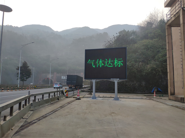 华蓥山隧道地质结构复杂,因修建时穿越煤层采空区,产生了甲烷、硫化氢、一氧化碳等各种气体。历年来,气体数据值安全控制和气体异味投诉处理一直是隧道安全管制的重点工作。为进一步消除过往司乘人员对气体异味的担忧,确保华蓥山隧道各项气体数据值在安全可控范围之内。川东公司于2021年12月,分别在华蓥山隧道左右线入口各安装了一块3*4米的T型可变情报板,主要对过往司乘显示华蓥山隧道内各项气体数据值的达标情况,目前已正式使用。