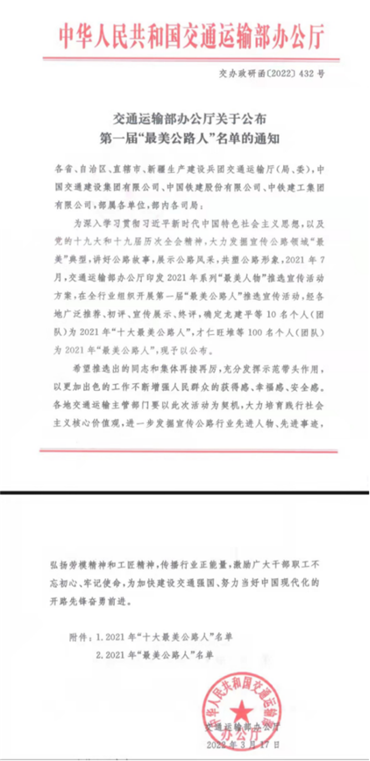 雅眉乐公司勇刚大队喜获交通运输部第一届“最美公路人”荣誉称号