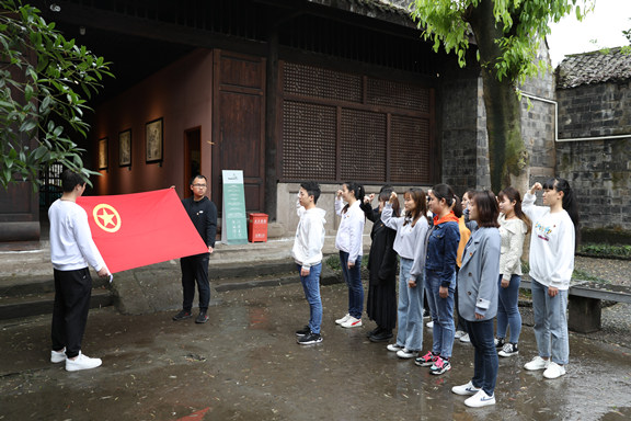 在同济大学医学院旧址,全体团员举起右手,在鲜艳的团旗下重温了入团誓词,铿锵有力的誓词回荡在现场每一位团员心中。