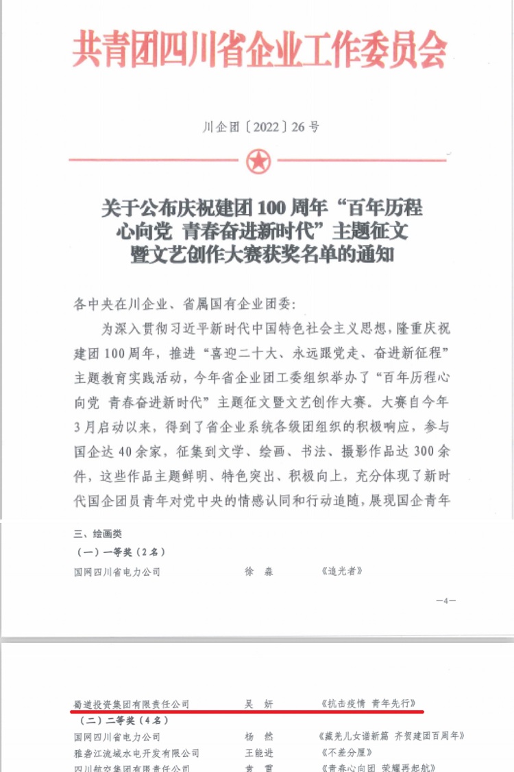 为深入贯彻习近平新时代中国特色社会主义思想,隆重庆祝建团100周年,推进“喜迎二十大、永远跟党走、奋进新征程”主题教育实践活动,成德南公司团委主动作为,不断加大宣传力度,并积极组织动员公司青年职工参加了省企业团工委组织举办的“百年历程心向党 青春奋进新时代”主题征文暨文艺创作大赛,其中由三台停车区吴妍创作的作品《抗击疫情 青年先行》获得绘画类一等奖。