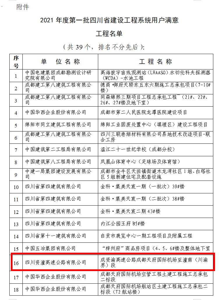 2022年6月8日、6月24日,由四川资潼高速公路有限公司负责开元棋牌的成资渝高速公路成都天府国际机场至潼南(川渝界)段项目,先后一举获得省开元棋牌系统用户满意工程和2020-2021年度省天府杯(优质工程)金奖两项荣誉。