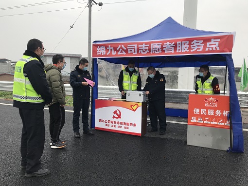 为全面做好2021年春运春节“冬安行动”相关工作,绵九公司坚持“以人为本、安全第一、服务至上、保障到位”的原则,在青莲收费站出口广场位置设立“绵九公司党员志愿者服务点”,为过往的驾乘人员提供便民服务。