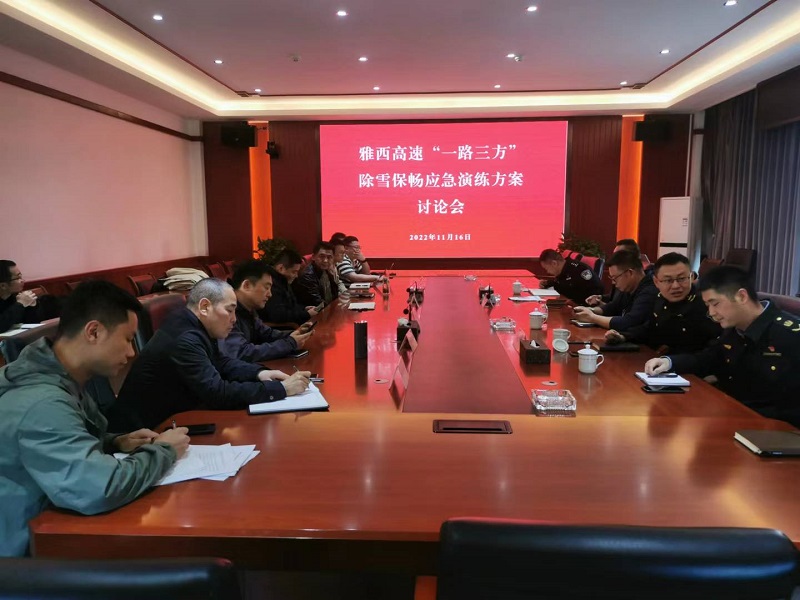 按照省交通运输厅11月3日在雅西高速公路应急指挥中心组织召开的雅西高速冰雪天气高效安全通行联席会议精神,为切实做好冬季除雪保畅应急演练各项工作。11月16日,雅西公司联席“一路三方”召开了除雪保畅应急演练方案第三次讨论会,会议由公司党委副书记、总经理刘武主持,省高管局、交通执法五支队、高速交警六支队相关人员及雅西公司相关部门负责人参加会议。