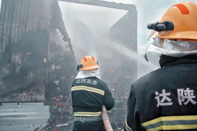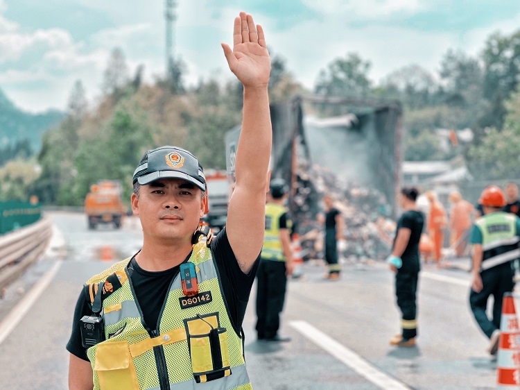 到达现场后,巡逻中队兵分两组。一组快速对事故区域开展锥形桶道路管控,配合高速公安进行道路管制,隔离危险区域,疏通抢险救援通道,便于消防车、清障车等第一时间进场救援;二组立即联系监控分中心更改沿线可变信息情报板“前方道路发生事故,请所有车辆减速慢行!”提示过往车辆减速安全驾驶。并采用退防值守方式,退至事故管控区后方警示社会车辆减速慢行,最大程度避免二次事故发生;大队消防车到达车辆自燃现场后,兼职消防员熟练使用消防水枪配合万源市消防大队对自燃大货车开展多点位喷水灭火作业,力争最快速度控制火情,扑灭火源。
