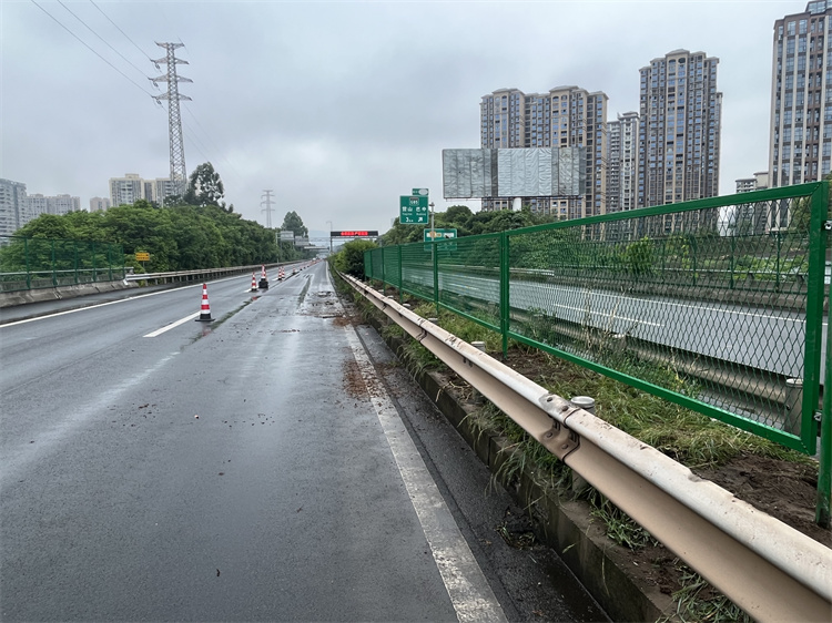 2022年,受夏季连续高温干旱天气影响,南广路全线中央分隔带灌木受灾严重,特别是主线桥中央分隔带绿化植物(柏树)因土层薄,蓄水力不足,几乎全部死亡。广安管理处高度重视,经过多方商讨和方案对比,最终确定将南广路全线主线桥中央分隔带死亡绿植更换为防眩网。