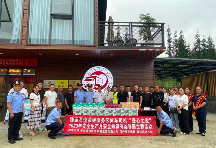 6月28日,由雅西公司联合四川省交通运输综合行政执法总队第五支队四大队、荥经县交通局、荥经县总工会在荥经服务区开展雅西高速荥经服务区货车司机“暖心之家”2023年安全生产月知识有奖答题和“党旗高高飘扬在雅西”庆七一主题党日活动。现场邀请到荥经县物流公司货车司机及家属共计30余名,其中货车司机党员代表3人。活动以“人人讲安全 个个会应急”为主题,有奖答题活动题目涵盖2023年安全生产月主题、三不伤害、交通安全、高速公路限速标志等安全知识。