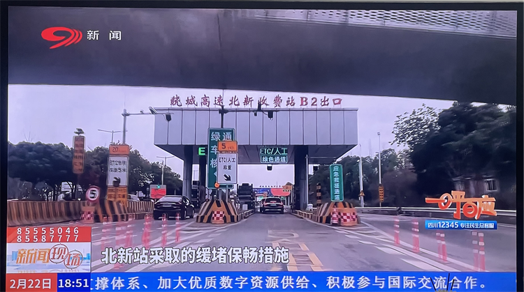 2月22日,四川电视台记者在川西公司成都绕城高速北新站现场采访收费站人员,以宣传此类高速公路通行特殊情况的处理办法。