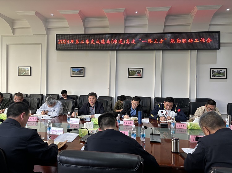 为进一步做好成德南公司辖区高速“一路三方”联勤联动工作,提高道路服务保障工作效率,确保辖区高速运营安全畅通,4月1日下午,成德南公司组织召开成德南(绵遂)高速“一路三方”联勤联动工作会,公司党委副书记、董事、总经理杨勇出席会议并讲话。四川高速公安二分局六大队、五分局十五大队,省交通执法总队第二支队八大队、十二大队、十三大队负责人参会并作工作交流。银发救援、川和蓉达、日常养护、绿化保洁等单位主要负责人,成德南公司相关部门、各管理处主要负责人参加会议。