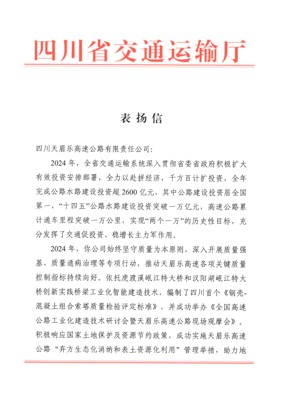 岁末年初,天眉乐公司再传喜讯,收到一封来自四川省交通运输厅的表扬信,对公司在质量管控、科技创新以及耕地保护等方面所取得的卓越成就给予了高度认可和表扬。
