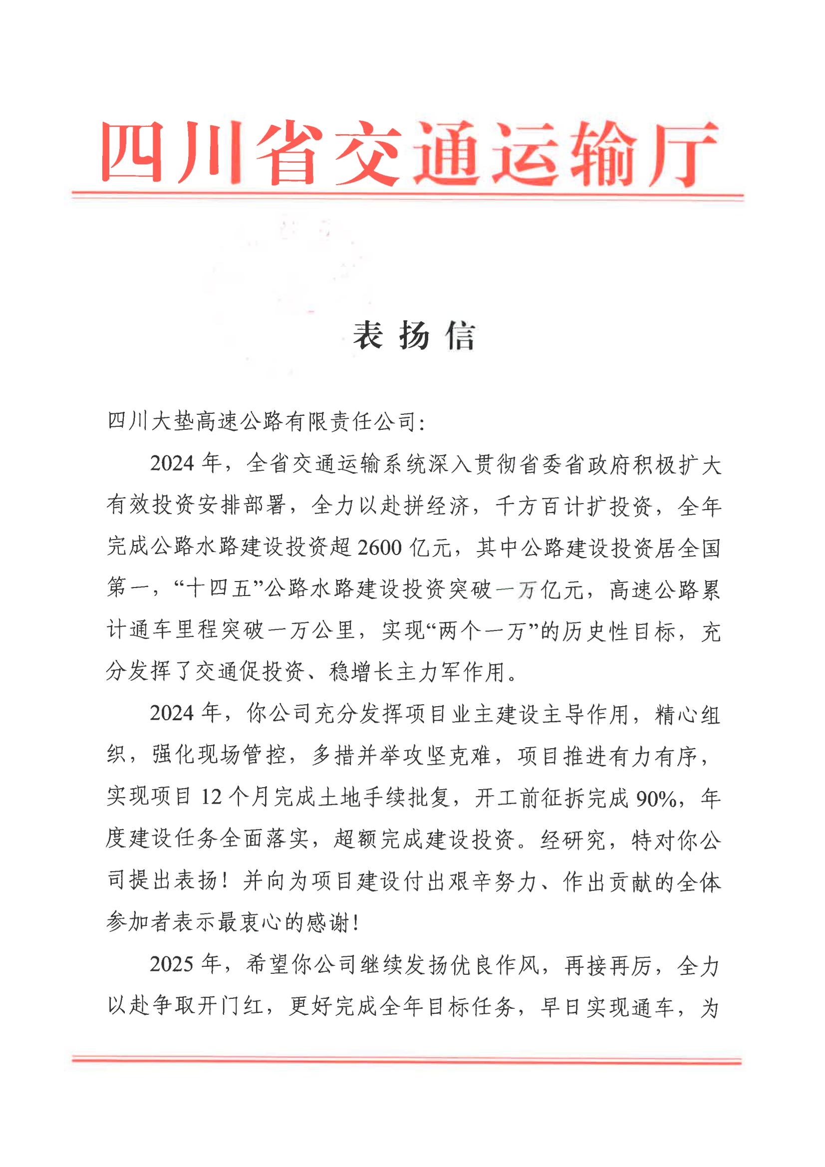 岁序更替,华章日新。近日,大垫公司凭借在项目开元棋牌中的卓越表现,喜获四川省交通运输厅表扬信。信中对公司在项目推进、土地报批、征地拆迁以及开元棋牌投资等关键领域所达成的斐然佳绩,给予了诚挚且高度的认可与褒扬。
