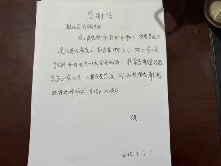 2月3日,雅西公司荥经服务区工作人员在日常巡查时,看到餐厅的椅上有一个女士挎包,四周无人,便立刻通过广播寻找失主,同时调取监控录像,发现该背包的主人已驾车驶离服务区。为尽快联系失主,服务区工作人员决定从包内查找信息,打开包发现包内装有现金5305元、两张身份证、一张社会医疗保障卡和6张银行卡,服务区工作人员通知高速交警立即联系失主。10分钟后失主联系工作人员,自己已在返回服务区的路上,服务区工作人员一边安抚王女士,一边告知她包已妥善存放。40分钟后,王女士到达荥经服务区,看见自己的包完好无损保存在服务区办公室里,她喜极而泣,表示被服务区管理人员拾金不昧的善举感动,当场拿出500元作为酬谢并写下感谢信。服务区管理员婉言谢绝,同时提醒王女士今后要注意带好随身携带的贵重物品,避免丢失。
