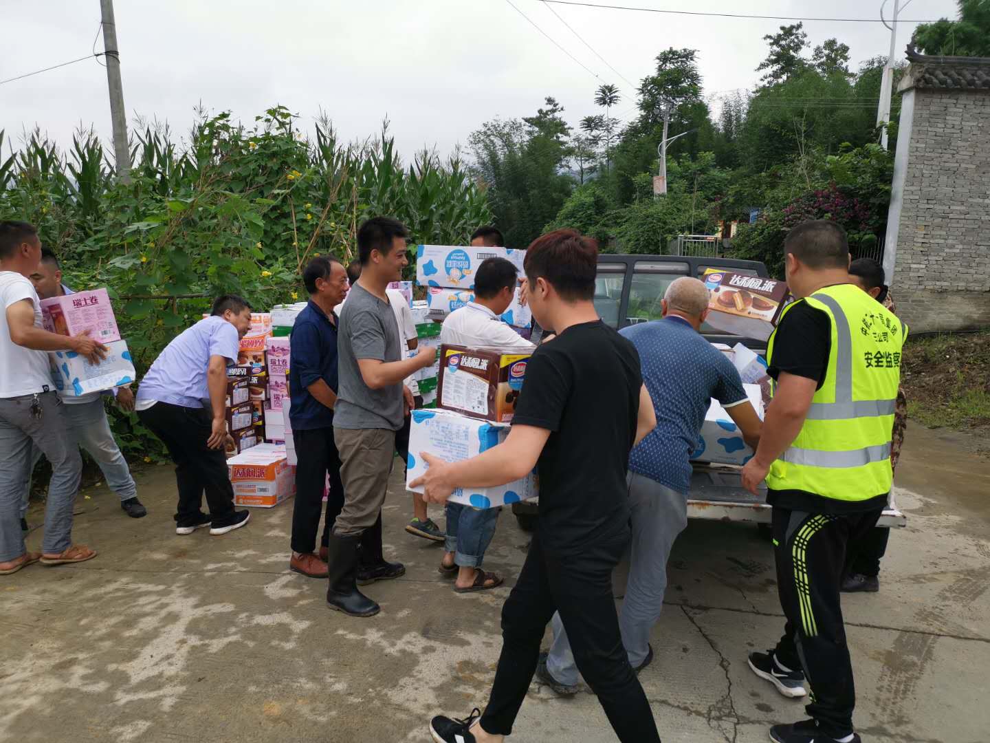 6月19日,完成救援安排后,又将200箱水,200箱方便面和面包、火腿肠等食品送到了双河镇桂花村灾民手中。