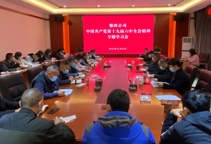 11月15号,雅西公司党委召开了中国共产党第十九届六中全会精神专题学习会。雅西公司党委书记、董事长于天才主持学习会,雅西公司领导班子成员、中层干部、机关党员代表和入党积极分子代表40余人参加学习。